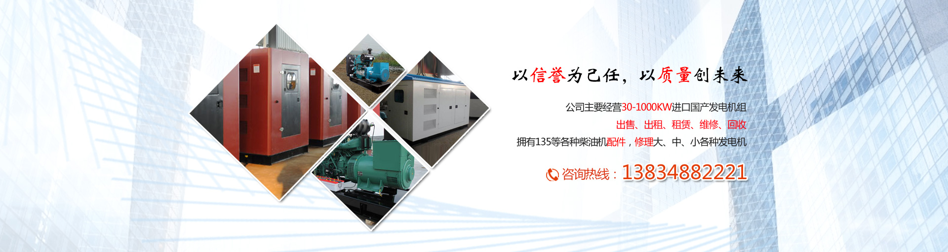 公司主要經營30-1000KW進口國產發電機組的出售、出租、租賃、維修、回收,擁有135等各種柴油機配件,修理大、中、小各種發電機。能隨時為廣大客戶提供各種進口及國產品牌發電機組。配備專業司機和維修維護人員,專業的服務、先進的設備,現場使用零故障。本公司發電機組具備以下特點:噪音低、性能可靠、穩定性高、節能環保。我們可以滿足用戶長短期用電;面向建筑工地、公路建設、地鐵施工、野外作業、商場備用、醫院應急、影視媒體、單位供暖等多家企事業單位提供租賃業務。